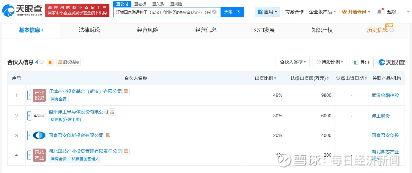每经AI快讯,天眼查工商信息显示,近日,江城国泰海通神工(武汉)创业投资基金合伙企业(有限合伙)成立,执行事务合伙人为国泰君安创新投资有限公司,出资额2亿元人民币,经营范围为私募股权投资基金管理、创业投资基金管理服务。合伙人信息显示,该基金由江城产业投资基金(武汉)有限公司、神工股份(688233)、国泰海通旗下国泰君安创新投资有限公司等共同出资。