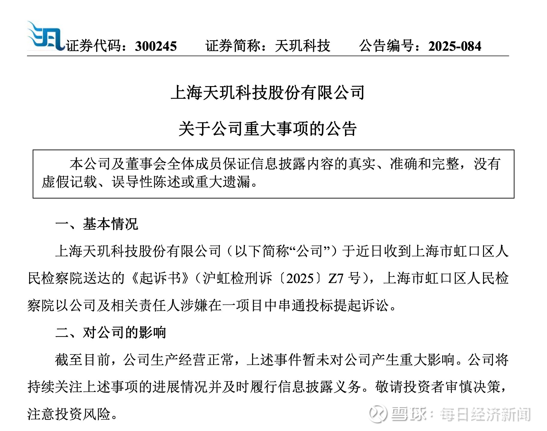 12月22日,天玑科技(300245.SZ)公告称,公司于近日收到上海市虹口区人民检察院送达的《起诉书》,上海市虹口区人民检察院以公司及相关责任人涉嫌在一项目中串通投标提起诉讼。目前公司生产经营正常,上述事件暂未对公司产生重大影响。