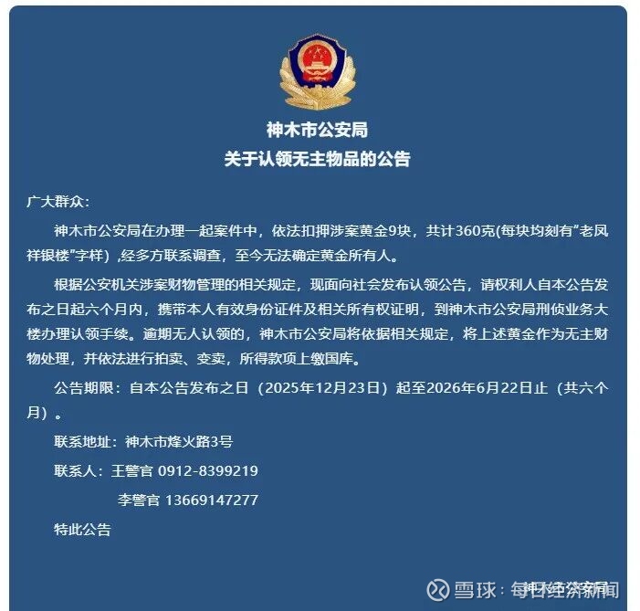 12月23日,陕西省神木市公安局发布“关于认领无主物品的公告”:神木市公安局在办理一起案件中,依法扣押涉案黄金9块,共计360克(每块均刻有“老凤祥银楼”字样),经多方联系调查,至今无法确定黄金所有人。