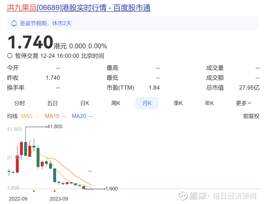 截至停牌前,洪九果品股价已跌至1.74港元,总市值仅剩27.95亿港元,较巅峰蒸发超95%。
