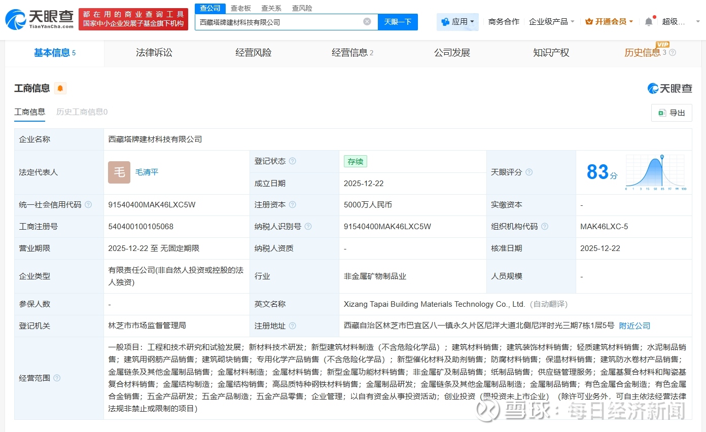 每经AI快讯,天眼查App显示,近日,西藏塔牌建材科技有限公司成立,法定代表人为毛清平,注册资本5000万元人民币,经营范围包括工程和技术研究和试验发展、新材料技术研发、新型建筑材料制造、新型金属功能材料销售等。股东信息显示,该公司由塔牌集团全资持股。