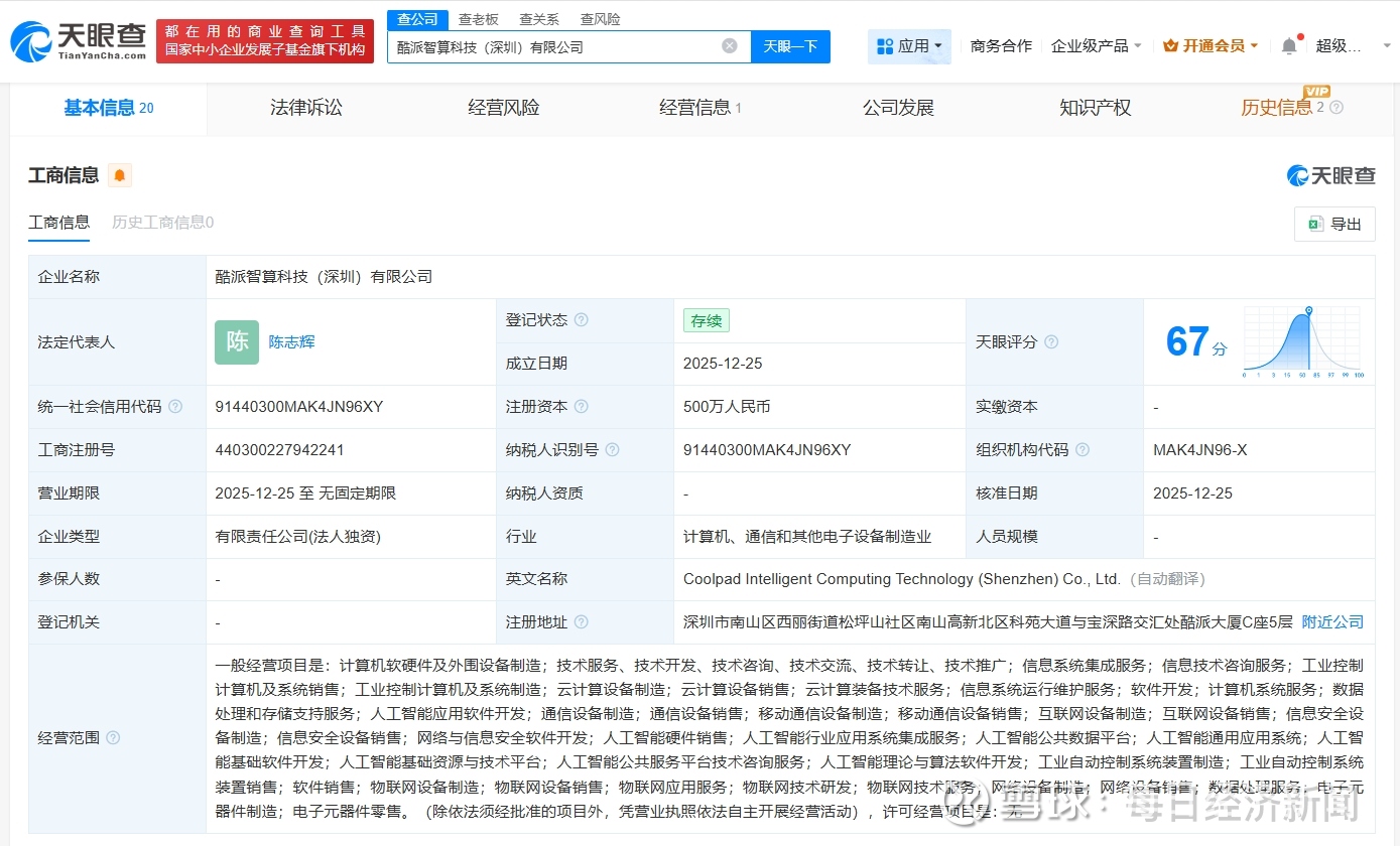 每经AI快讯,天眼查工商信息显示,近日,酷派智算科技(深圳)有限公司成立,法定代表人为陈志辉,注册资本500万元人民币,经营范围包括工业控制计算机及系统制造、云计算设备制造、人工智能应用软件开发、人工智能理论与算法软件开发等。股东信息显示,该公司由酷派智投科技(深圳)有限公司全资持股。