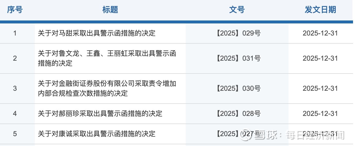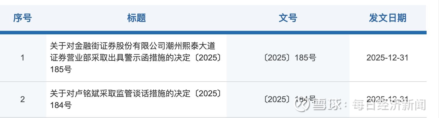 7名员工违规细节曝光2025年12月31日,内蒙古证监局与广东证监局同步披露了对金融街证券的监管动作。在内蒙古地区,马甜、鲁文龙、王鑫、王丽虹、郝丽珍、康诚等6名分布在包头、牙克石、呼和浩特的员工被采取警示函措施;在广东地区,卢铭斌则被采取监管谈话措施。这种大面积、跨区域的人员违规,直接反映出公司对分支机构及从业人员管控有效性不足。
