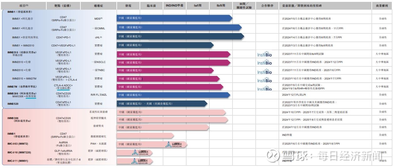 而推进最快的IMM01(替达派西普),被内部视作“重磅炸弹产品”,针对慢性粒单核细胞白血病的一线治疗,计划于今年之内完成Ⅲ期中期分析。