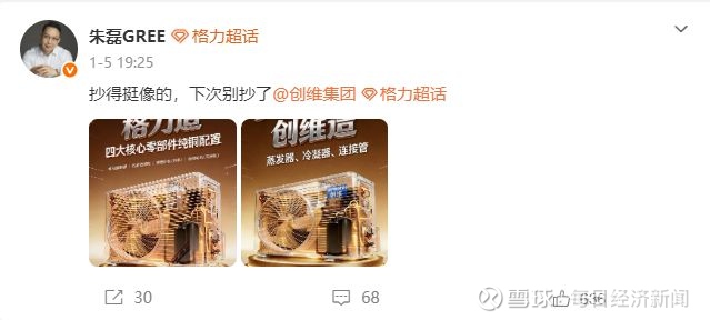 1月5日晚,朱磊在个人微博贴出两张相似度极高的图片,并配文称:“抄得挺像的,下次别抄了@创维集团。”这两张图,一张是格力电器的官方海报,另一张是来自创维空调官方微信视频号的视频截图,截图画面也是一张创维空调的宣传海报。