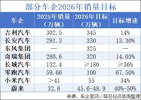 据《每日经济新闻》记者观察,2026年,传统汽车集团普遍坚持稳健增长策略,将新能源业务的深化转型与海外市场的版图扩张列为核心发力点;而造车新势力及跨界入局的科技企业,则凭借2025年的高速交付势头与产品口碑积累,纷纷设定大幅超越行业平均增速的激进目标,力求在智能电动赛道抢占更多市场份额。