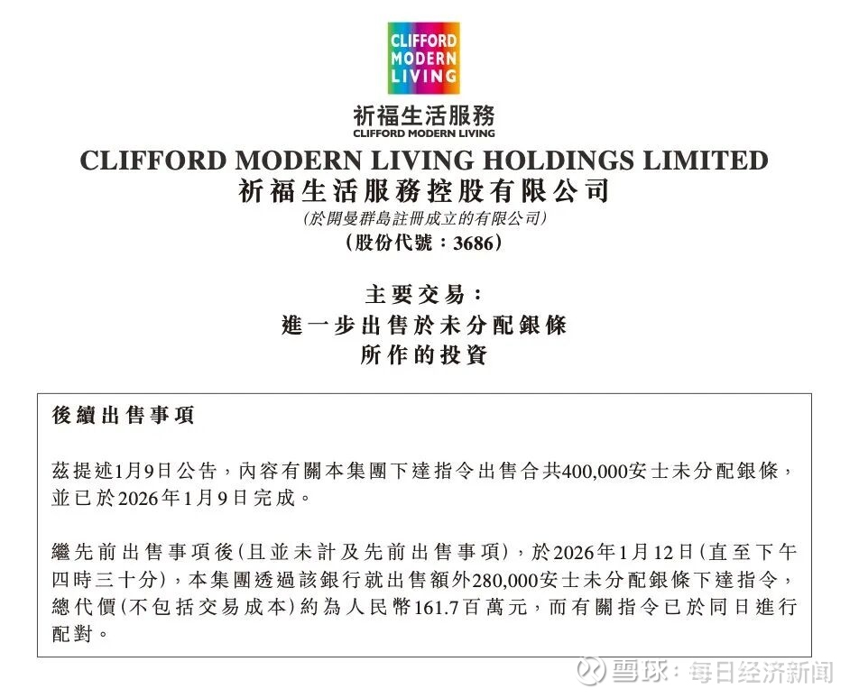 祈福生活服务在公告中表示:“投资未分配银条是作为本集团财务管理的一部分。经考虑未分配银条的当前市场趋势,尤其是近期市价已达近年最高,董事认为,现在是本集团变现部分未分配银条投资的合适时机。”