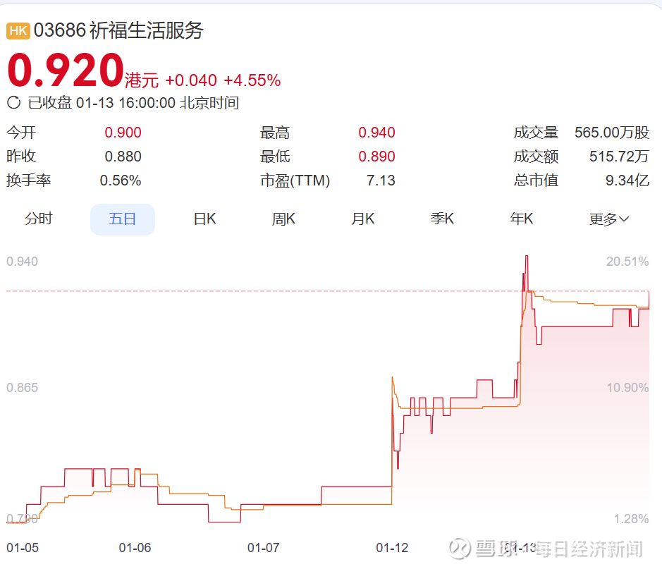 资本市场迅速给出积极反应,1月12日复牌后,祈福生活服务股价全日飘红,单日涨幅8.64%。1月13日再涨4.55%。