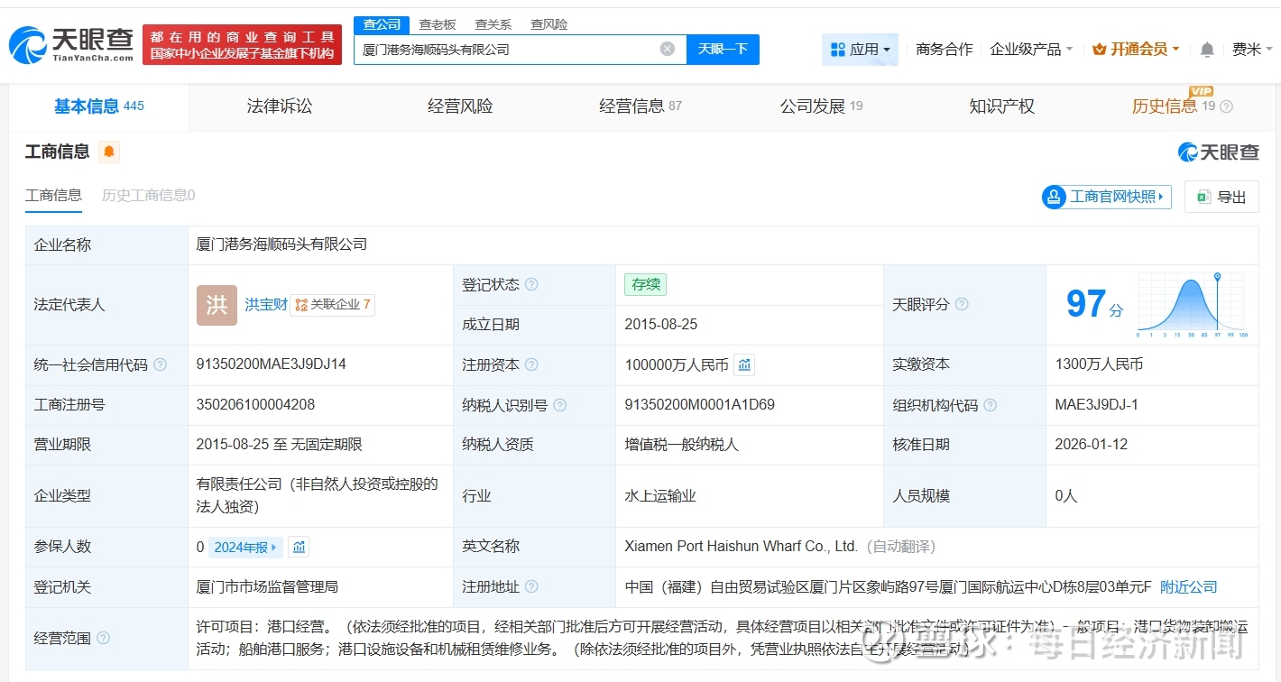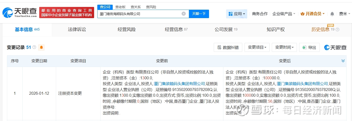 每经AI快讯,1月15日,天眼查工商信息显示,近日,厦门港务海顺码头有限公司发生工商变更,注册资本由1300万元人民币增至10亿元人民币,增幅约7592%。厦门港务海顺码头有限公司成立于2015年8月,法定代表人为洪宝财,经营范围为港口经营、港口货物装卸搬运活动、船舶港口服务、港口设施设备和机械租赁维修业务。股东信息显示,该公司由厦门集装箱码头集团有限公司全资持股。