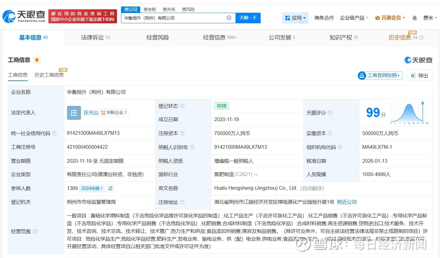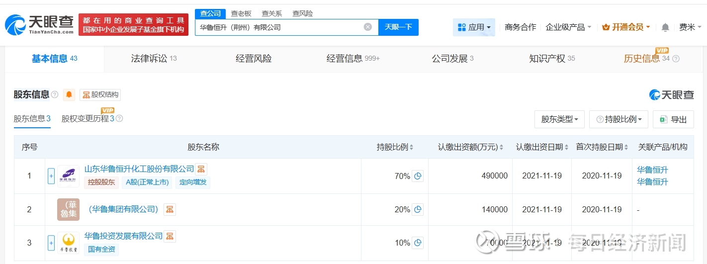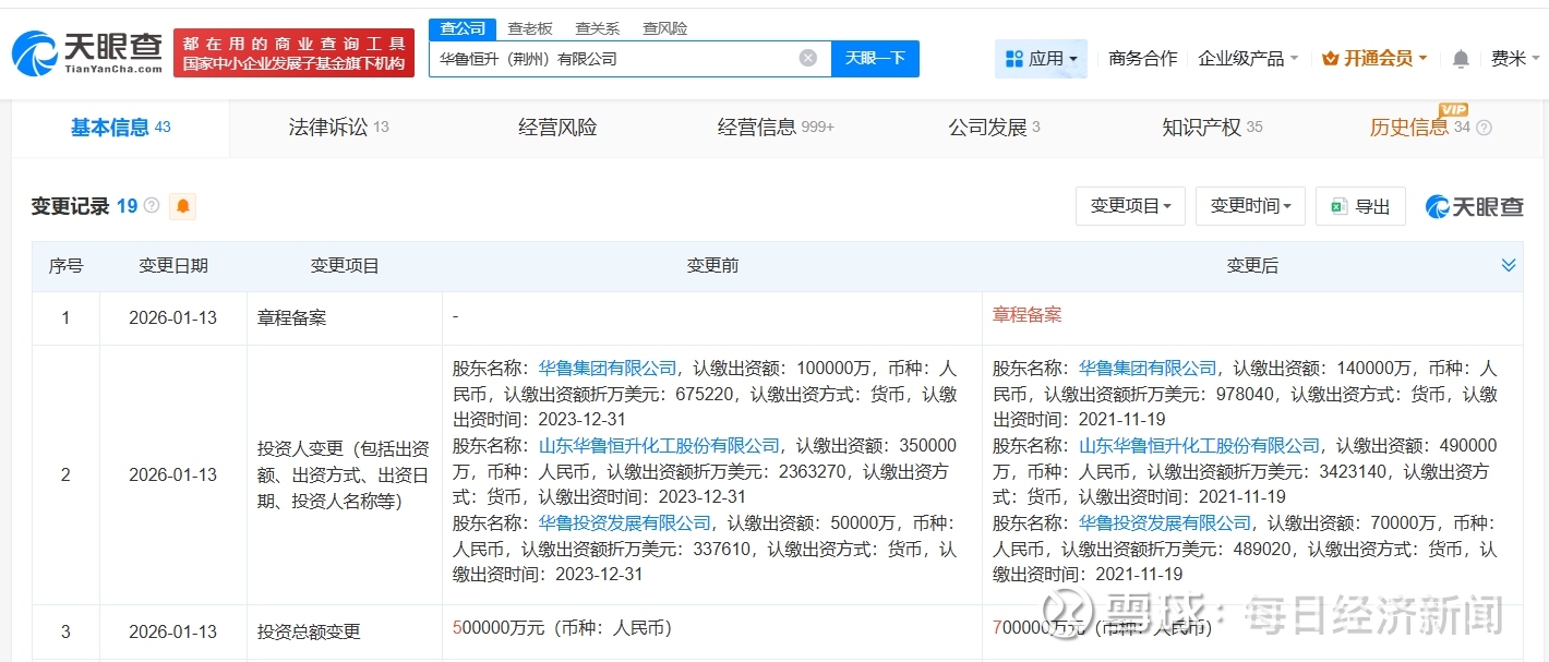 每经AI快讯,天眼查工商信息显示,近日,华鲁恒升(荆州)有限公司发生工商变更,注册资本由50亿元人民币增至70亿元人民币,增幅40%。华鲁恒升(荆州)有限公司成立于2020年11月,法定代表人为庄光山,经营范围包括基础化学原料制造、化工产品生产、化工产品销售、专用化学产品制造等。股东信息显示,该公司由华鲁恒升(600426)、华鲁集团有限公司、华鲁投资发展有限公司共同持股。