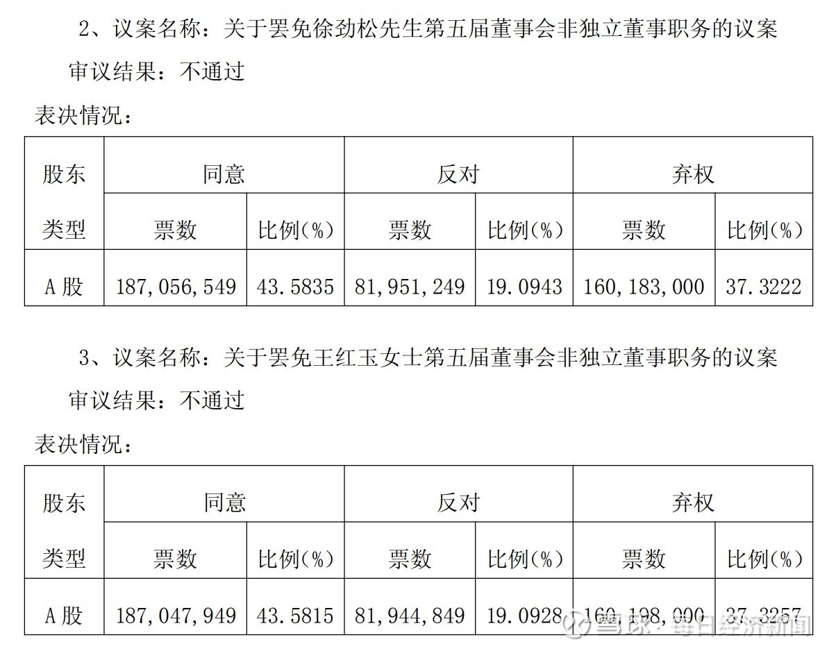 在罢免徐劲松、王红玉董事职务的议案中,同意票占比约为43.58%,反对票占比约为19.09%,弃权票占比则达到37.32%。在持股5%以下股东的表决中,同意票占比均超过64.76%。在两项补选董事的议案中,反对票占比显著上升,均超过56.41%。