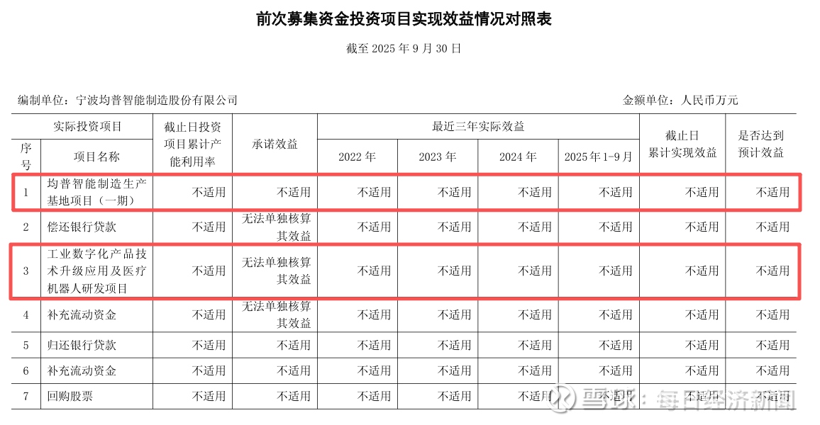 公司的两个IPO募投项目进展缓慢,也导致截至2025年9月30日这两个项目的效益相关栏目被填为“不适用”。