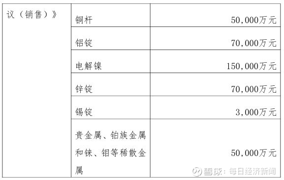 具体交易内容包括:采购方面,中国境外阴极铜预计年交易金额为6亿美元,广东省阴极铜为25亿元人民币,粗铜为6亿元人民币,中国境外电解镍为5000万美元;销售方面,阴极铜预计年交易额为58亿元人民币,铜杆5亿元人民币、铝锭7亿元人民币、电解镍15亿元人民币、锌锭7亿元人民币、锡锭3000万元人民币,以及贵金属和稀散金属5亿元。