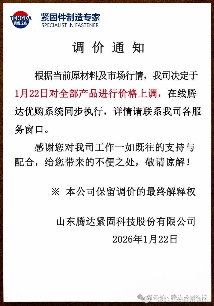 每经AI快讯,1月22日,腾达科技发布调价通知称,根据当前原材料及市场行情,公司决定于1月22日对全部产品进行价格上调,在线腾达优购系统同步执行。据了解,这是该公司本月第三次调价,也是第二次全部产品涨价。