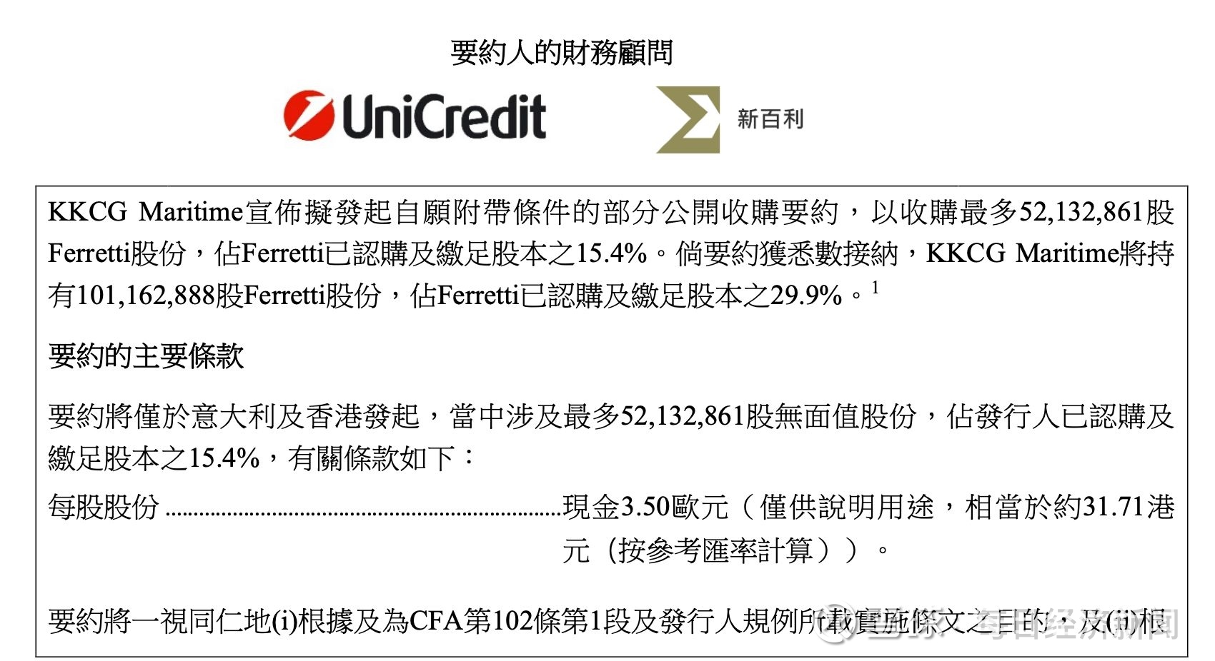 资料显示,要约人为KKCG,该公司为一间根据捷克共和国法律注册成立及营运的股份有限公司。该公司为一家投资及创新集团。KKCG为KKCG集团内专责海运业务的公司平台。除海运业务外,该集团经营多元化的投资业务组合,涵盖资讯科技服务、传统与再生能源及创新房地产开发,各业务均透过活跃于多个司法权区的领先附属公司管理,并划分为四大支柱产业:娱乐、能源、科技及房地产。KKCG创办人兼主席Karel Komrek,为一名捷克企业家、投资者及慈善家。Komrek先生拥有30年于多个行业创立及发展企业的往绩记录,涵盖娱乐、能源、房地产及科技。其事业版图亦透过与其妻子共同创立的Karel Komrek Family Foundation,延伸至社区发展、城市振兴及文化艺术教育领域。