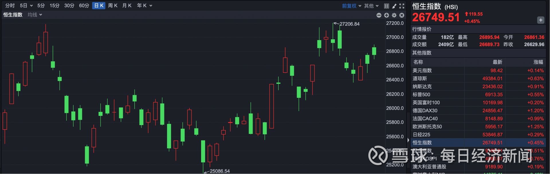 截至收盘,恒生指数报26749.51点,上涨110.55点,涨幅0.45%。