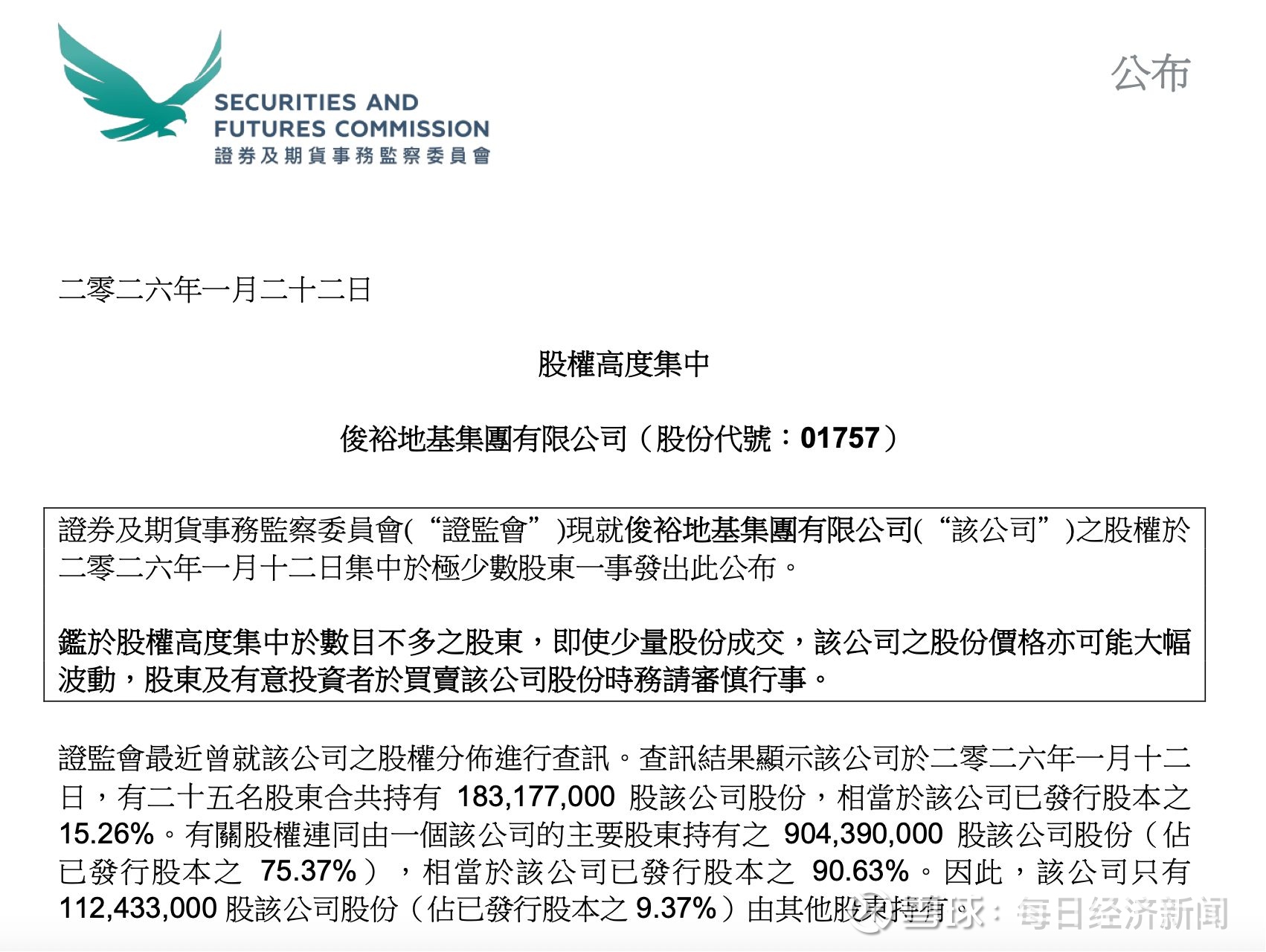 不过就在1月22日,香港证监会发布公告指,俊裕地基“股权高度集中”。