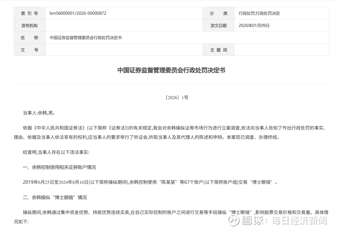 近日,中国证监会发布行政处罚决定书,认定余韩操纵证券市场行为成立。2019年6月3日至2024年8月15日期间,余韩控制使用67个证券账户,利用资金优势、持股优势,通过连续买卖、对倒交易等方式,操纵“博士眼镜”股票价格和交易量,扰乱证券市场秩序。