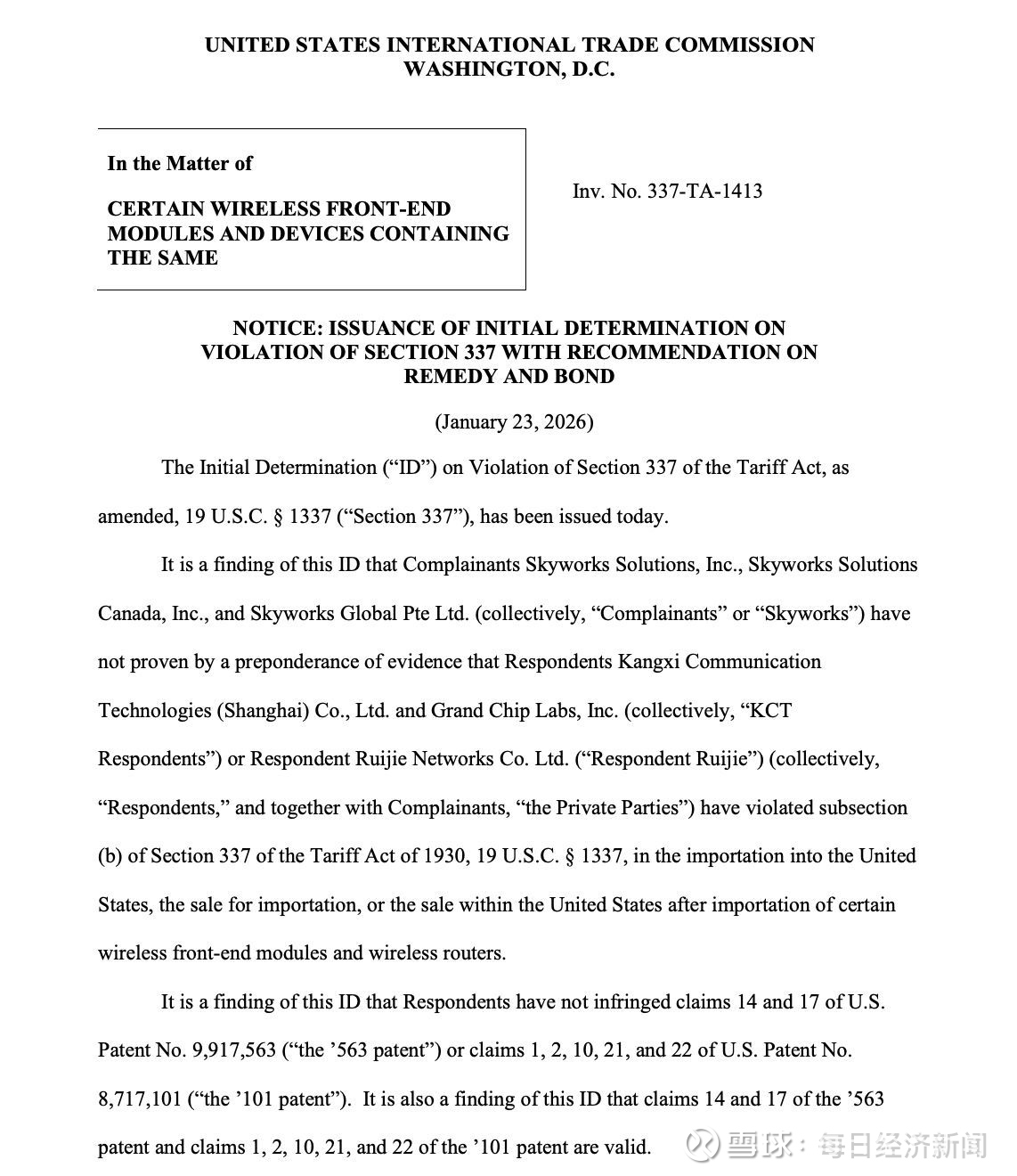 公告显示,美国国际贸易委员会(ITC)在1月23日作出初步裁决结果,认定康希通信等相关公司不存在侵犯Skyworks公司的两项专利(US 9,917,563 和 US 8,717,101 )之专利权。