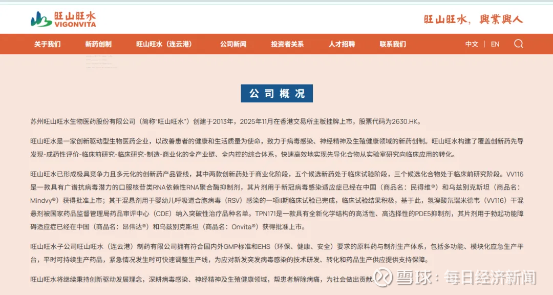 公司官网显示,苏州旺山旺水生物医药股份有限公司是一家创新驱动型生物医药企业,致力于病毒感染、神经精神及生殖健康领域的新药创制。旺山旺水构建了覆盖创新药先导发现-成药性评价-临床前研究-临床研究-制造-商业化的全产业链、全内控的综合体系,快速高效地实现先导化合物从实验室研究向临床应用的转化。旺山旺水创建于2013年,2025年11月在香港交易所主板挂牌上市。