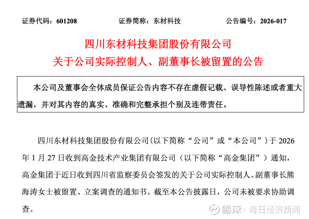 东材科技称,公司于2026年1月27日收到高金技术产业集团有限公司(下称“高金集团”)通知,高金集团于近日收到四川省监察委员会签发的关于公司实际控制人、副董事长熊海涛被留置、立案调查的通知书。截至公告披露日,公司未被要求协助调查。