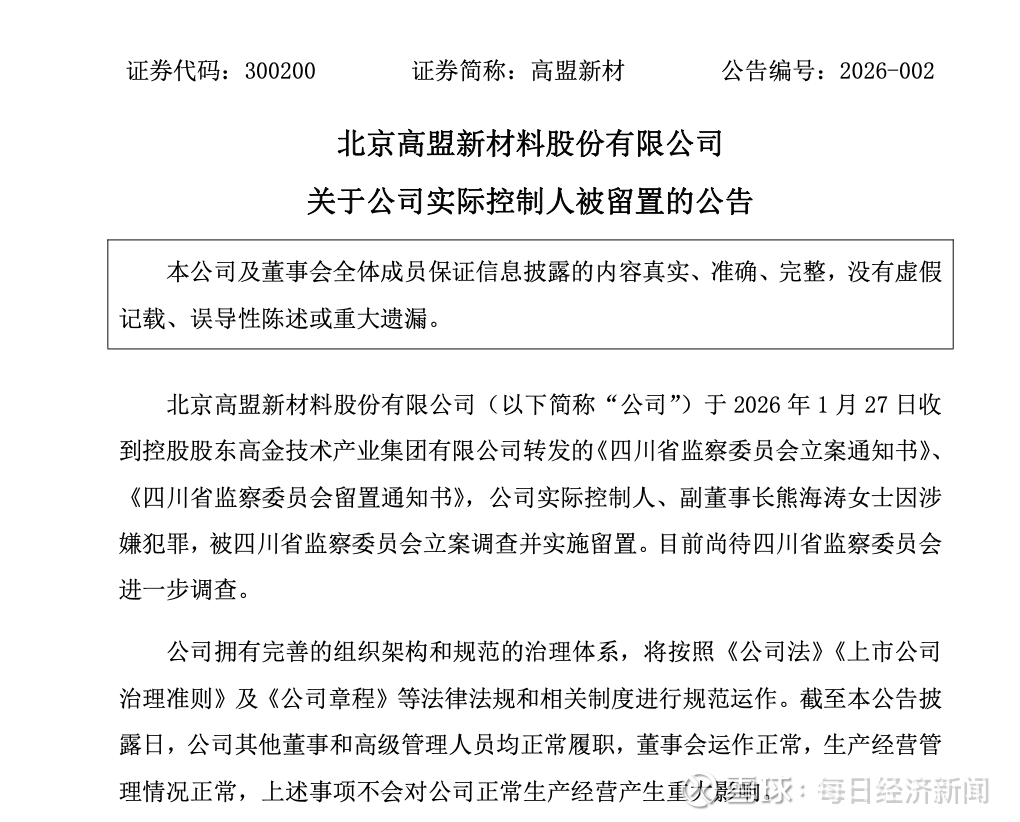 高盟新材公告,公司于2026年1月27日收到控股股东高金技术产业集团有限公司转发的《四川省监察委员会立案通知书》《四川省监察委员会留置通知书》,公司实际控制人、副董事长熊海涛因涉嫌犯罪,被四川省监察委员会立案调查并实施留置。目前尚待四川省监察委员会进一步调查。