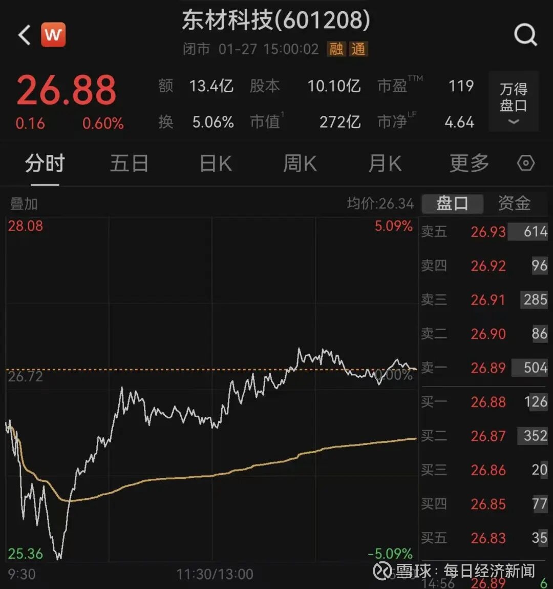 二级市场上,东材科技1月27日收涨0.6%报26.88元/股,最新市值为26.88亿元。