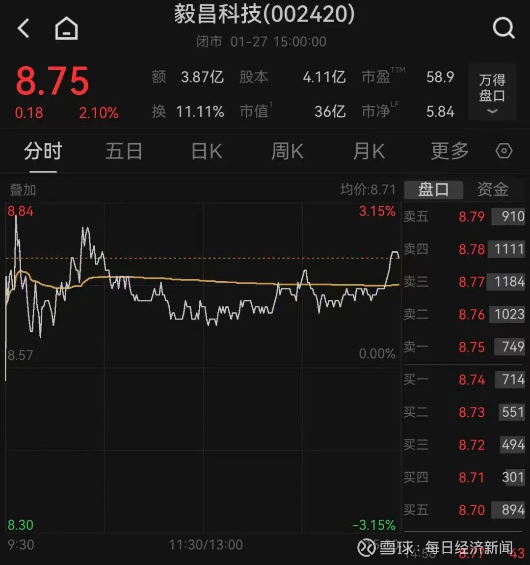 截至1月27日收盘,毅昌科技涨2.1%,报8.75元/股,总市值为36亿元。