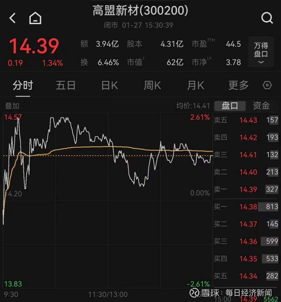 1月7日,高盟新材曾涨停。截至27日收盘,高盟新材涨1.34%,报14.39元/股,总市值为62亿元。
