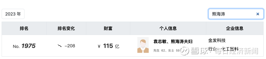 2023年3月23日,胡润研究院发布《2023胡润全球富豪榜》,袁志敏、熊海涛以115亿财富位列榜单第1975位。