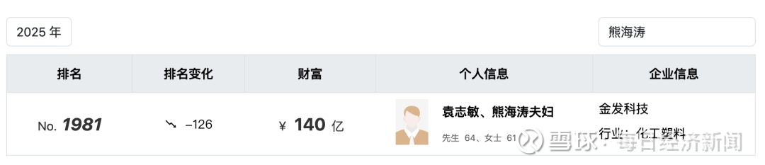 2025年3月27日,胡润研究院发布《2025胡润全球富豪榜》,袁志敏、熊海涛以140亿财富位列榜单第1981位。