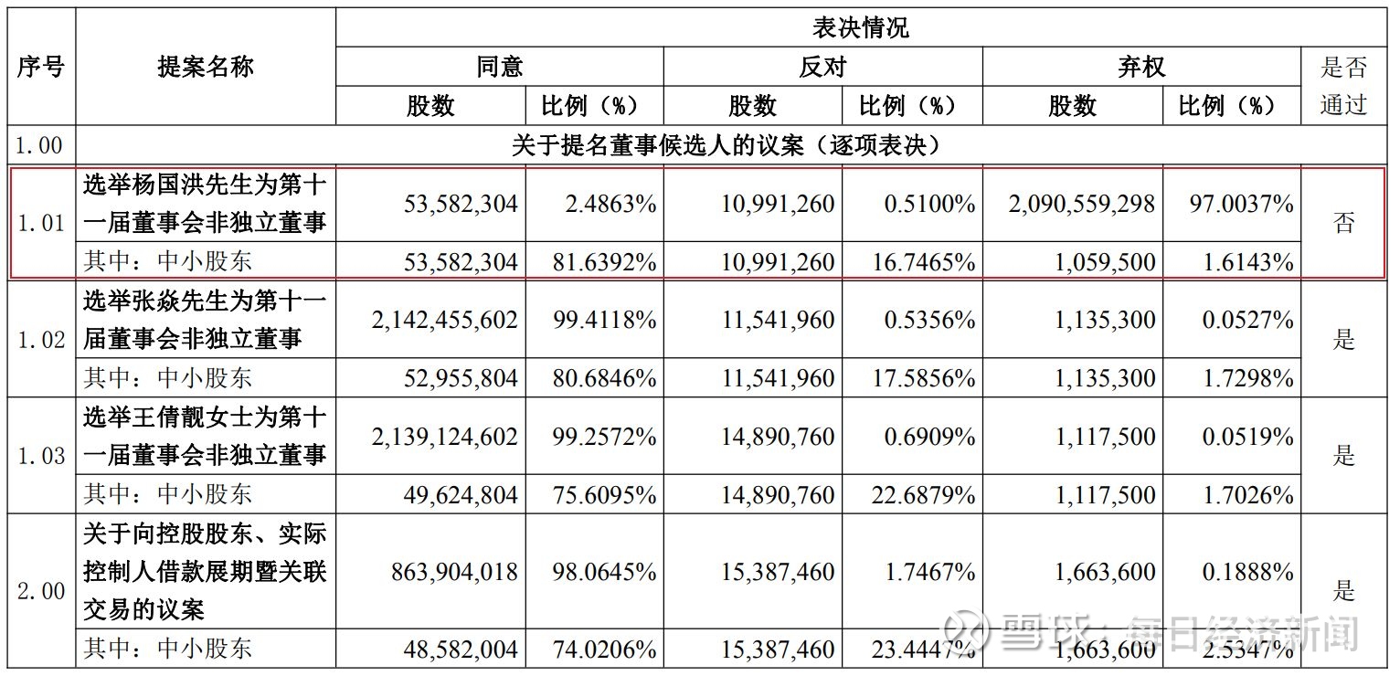 投出超20亿弃权票,董事候选人落选公告显示,本次临时股东会审议的《关于提名董事候选人的议案》中,《选举杨国洪先生为第十一届董事会非独立董事》议案未获得出席股东会的股东所持表决权的过半数通过,杨国洪未能当选公司第十一届董事会非独立董事。
