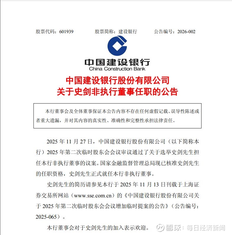 同日,建行公告称,2025年11月27日,本行2025年第二次临时股东会会议审议通过了关于选举史剑先生担任本行非执行董事的议案。国家金融监督管理总局现已核准史剑先生的任职资格,史剑先生正式就任本行非执行董事。