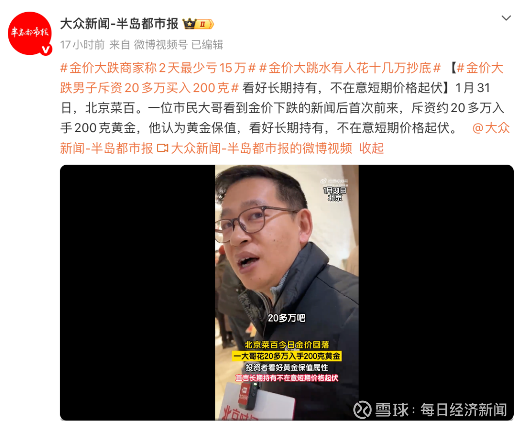 另据大众新闻-半岛都市报报道,1月31日,北京菜百。一位市民大哥看到金价下跌的新闻后首次前来,斥资约20多万元入手200克黄金,他认为黄金保值,看好长期持有,不在意短期价格起伏。