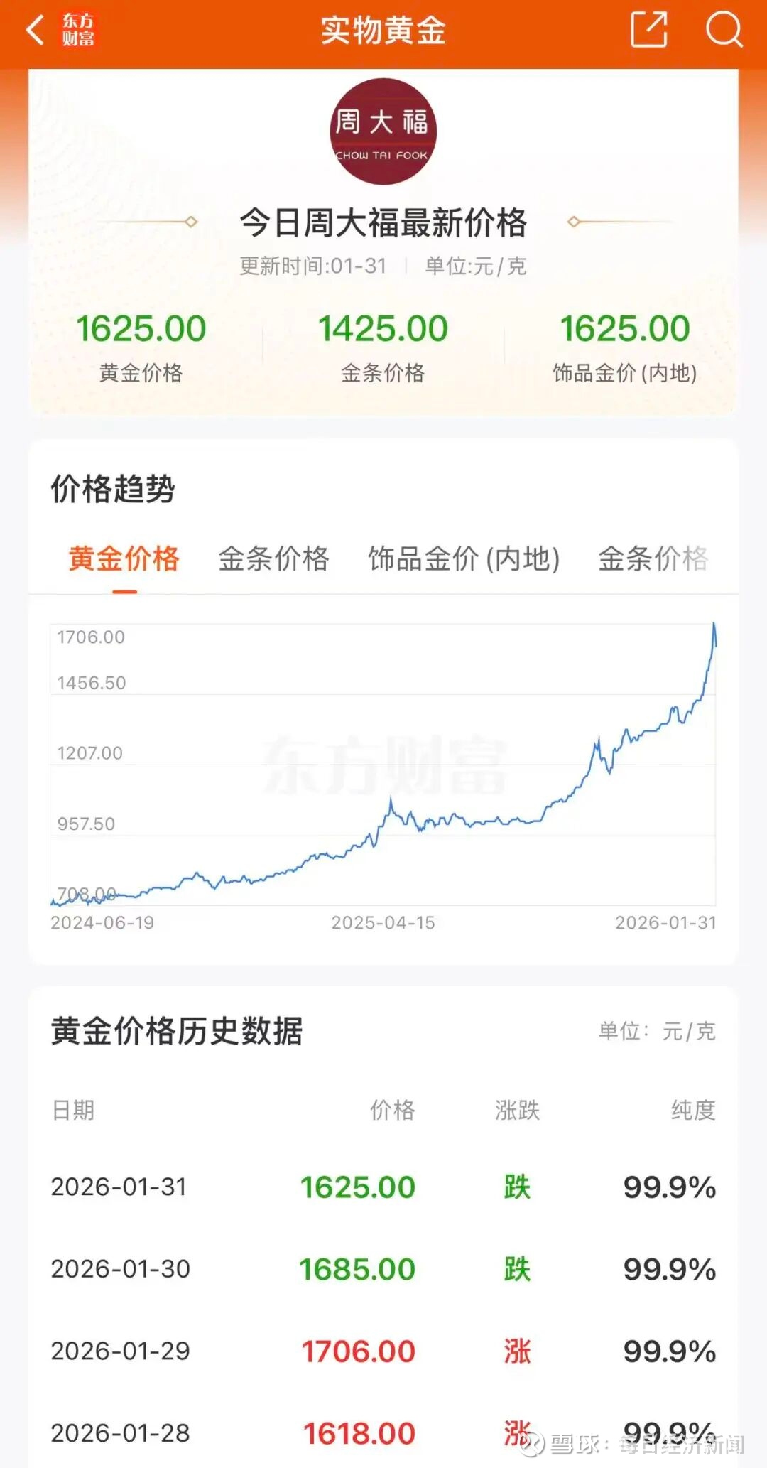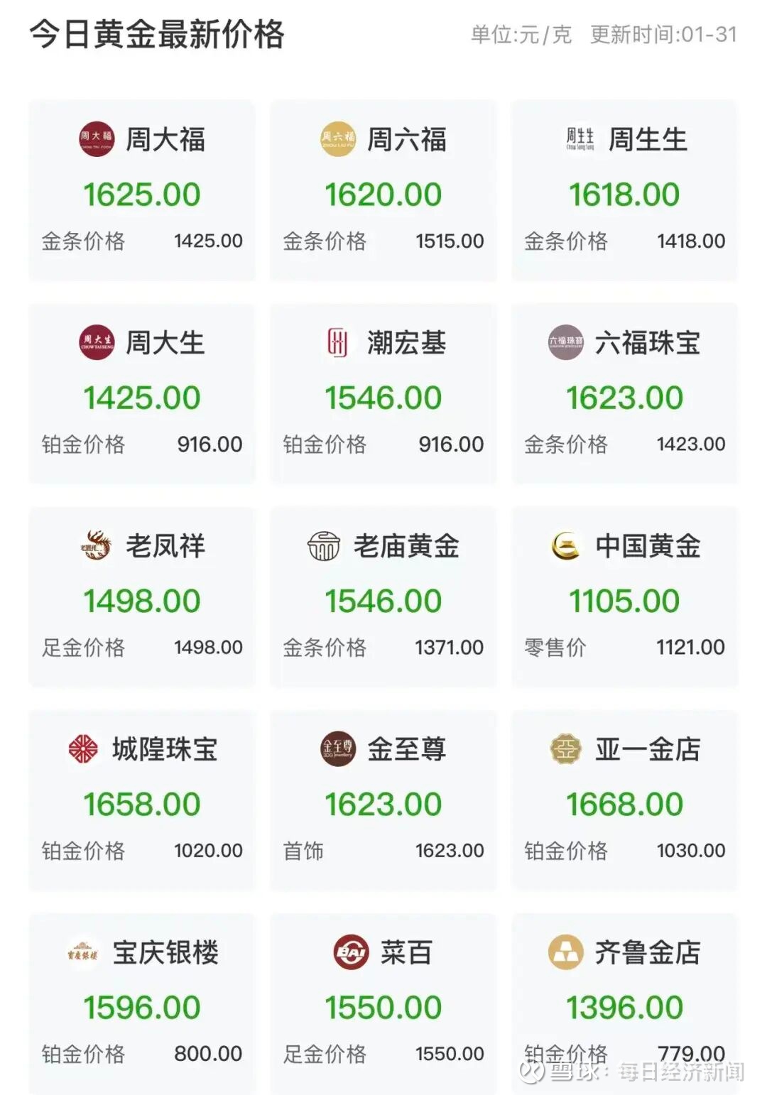 1月31日,周大福金饰报价1625元/克,周生生金饰报价1618元/克。而1月29日周大福金饰报价1706元/克、周生生金饰报价1708元/克,1月30日周大福金饰报价1685元/克、周生生金饰报价1683元/克。以此计算,周大福金饰克价在1日内跌了60元、2日跌了81元。周生生金饰克价1日跌了65元,2日跌了90元。