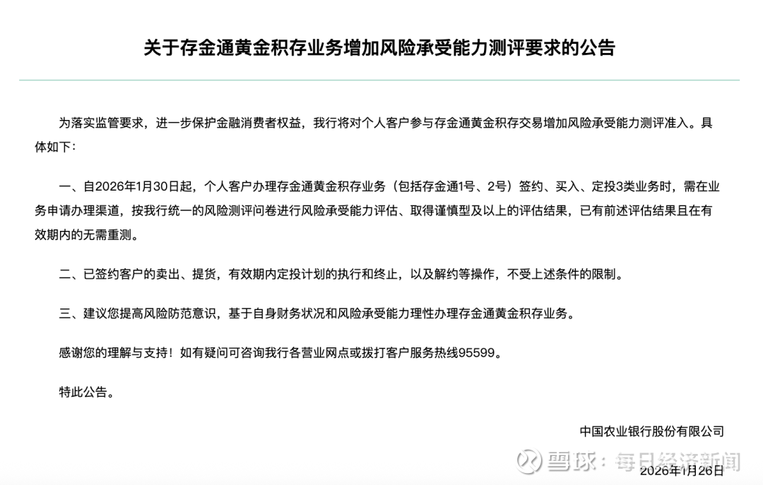 农业银行公告自1月30日起,增加对个人客户参与存金通黄金积存交易风险承受能力测评准入。个人客户办理签约、买入、定投三类业务,风险承受能力评估需达谨慎型及以上,有效测评结果无需重测;卖出、提货、定投计划执行与终止、解约等操作不受该条件约束。