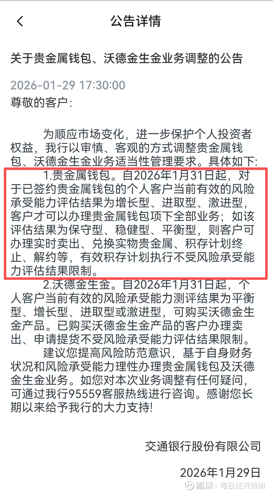 交通银行最新公告显示,1月31日起,增长型、进取型、激进型风险等级客户可办理贵金属钱包全部业务,如该评估结果为保守型、稳健型、平衡型,则客户可办理实时卖出、兑换实物贵金属、积存计划终止、解约等,有效积存计划执行不受风险承受能力评估结果限制。