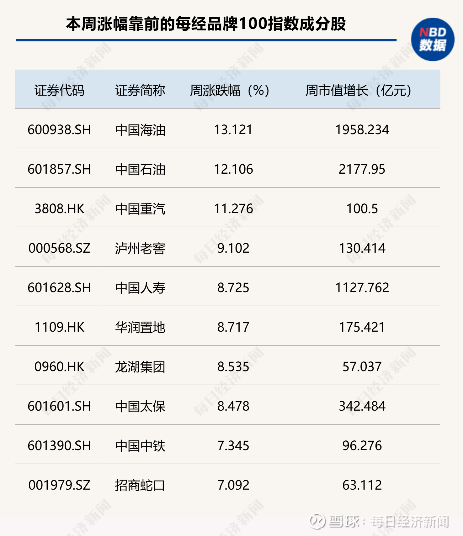 油价推动中国海油股价创新高从本周每经品牌100指数成分股表现来看,中国海油和中国石油周内涨幅均超过10%,其中,中国海油单周涨幅达到13.12%,股价创出历史新高。