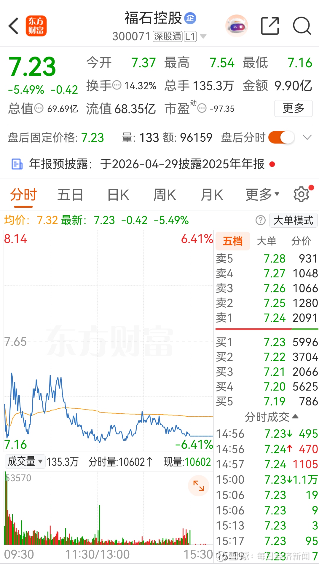 截至1月30日收盘,福石控股股价报7.23元/股,总市值为69.69亿元。