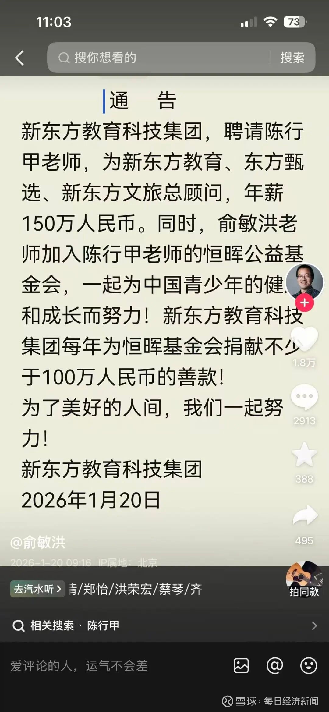1月20日,俞敏洪在自己个人社交平台,以新东方教育科技集团名义发布了一则通告:“新东方教育科技集团,聘请陈行甲老师,为新东方教育、东方甄选、新东方文旅总顾问,年薪150万人民币。”