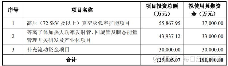 据定增预案,旭光电子本次向特定对象发行募集资金总额不超过人民币10亿元(含本数),扣除发行费用后将全部用于高压(72.5kV及以上)真空灭弧室扩能项目,等离子体加热大功率发射管、回旋管及瞬态能量管理开关研发及产业化项目,以及补充流动资金。