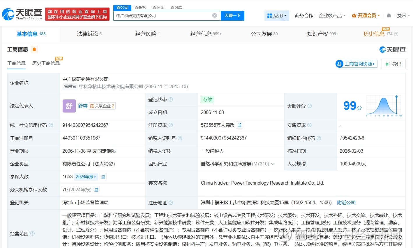 每经AI快讯,天眼查App显示,近日,中广核研究院有限公司发生工商变更,注册资本由约41.4亿元人民币增至约57.4亿元人民币,增幅约39%。该公司成立于2006年11月,法定代表人为舒睿,经营范围包括自然科学研究和试验发展、工程和技术研究和试验发展、核电设备成套及工程技术研发等,由中国广核(003816)全资持股。