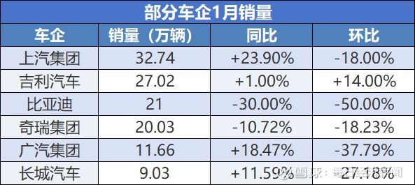 此外,比亚迪在1月销量为21万辆,同比减少约30%,环比下降50%。长城汽车1月销量约为9.03万辆,同比增加11.59%,环比下降27.18%。奇瑞集团1月销售20.03万辆,同比下滑10.72%,环比下降18.23%。