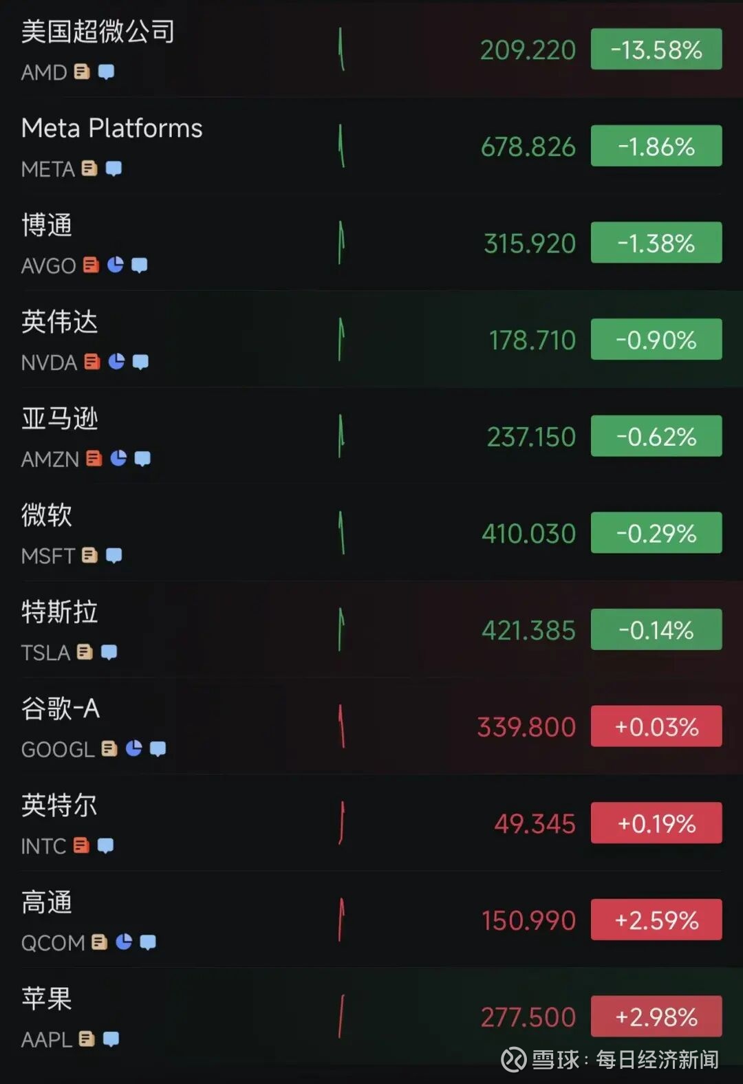 美股科技股多数下跌,AMD跌超13%,因其第一季度业绩指引不及部分分析师预期。Meta跌超1.86%,英伟达跌0.9%,亚马逊跌0.62%,微软跌0.29%,特斯拉跌0.14%,谷歌-A涨0.03%,英特尔涨0.19%,高通涨2.59%,苹果涨2.98%。