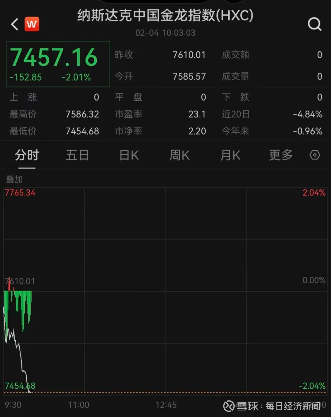 纳斯达克中国金龙指数跌超2%,最新报7457.16点。