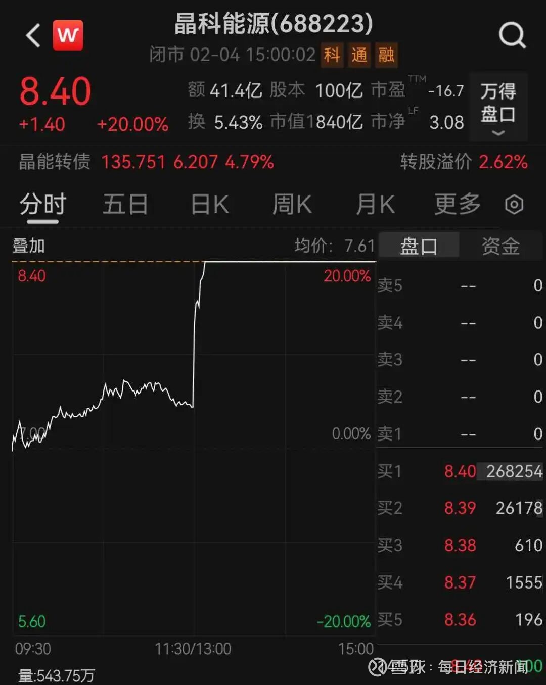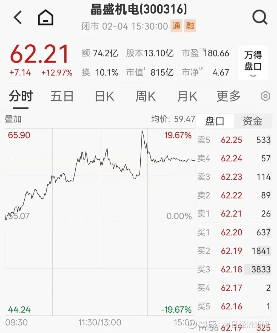 2月4日午后,光伏板块冲高,太空光伏方向强势领涨,晶科能源迅速拉出20%涨停。