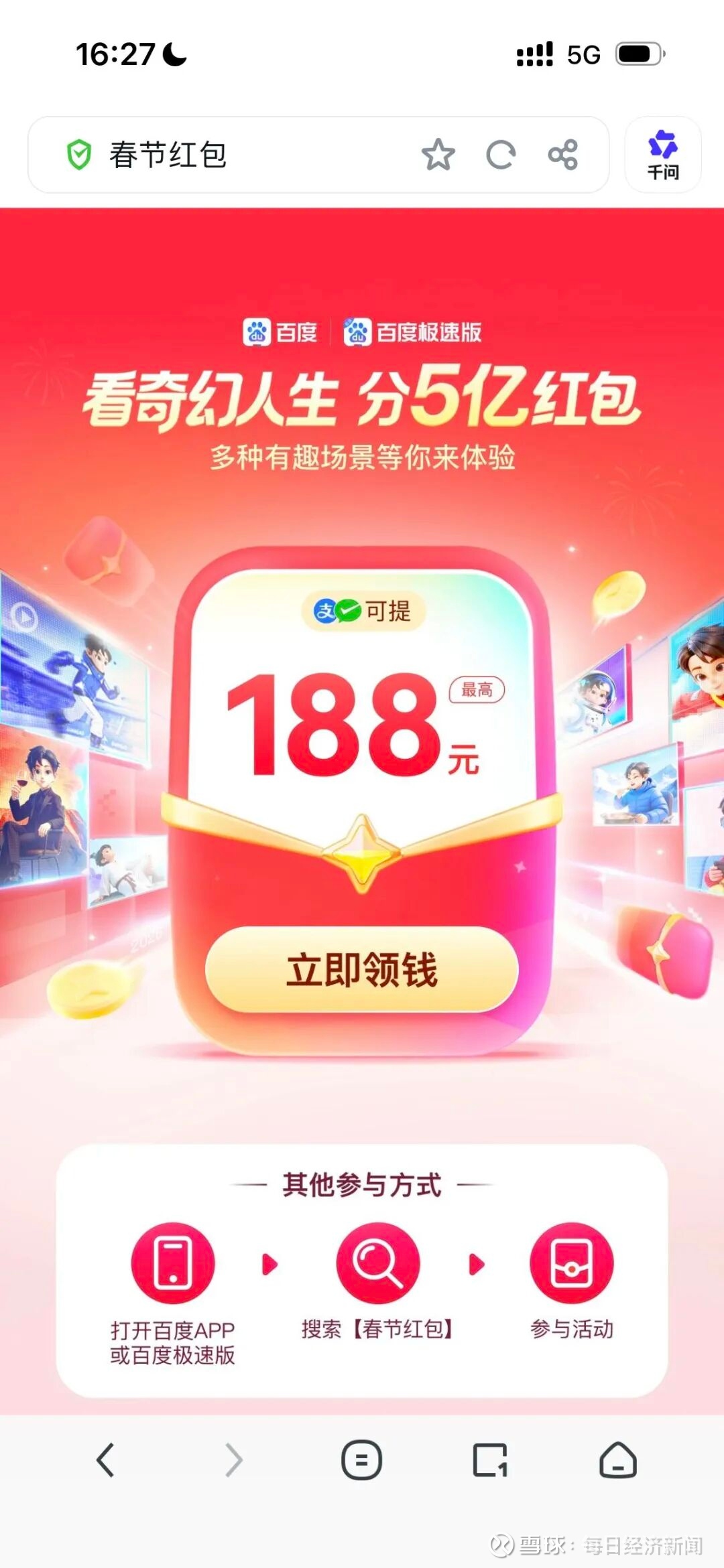 至于宣称“砸”5亿元春节红包的百度,则将红包领取与AI功能深度绑定。1月26日至3月12日,用户通过百度App使用文心助手即有机会领取现金红包。