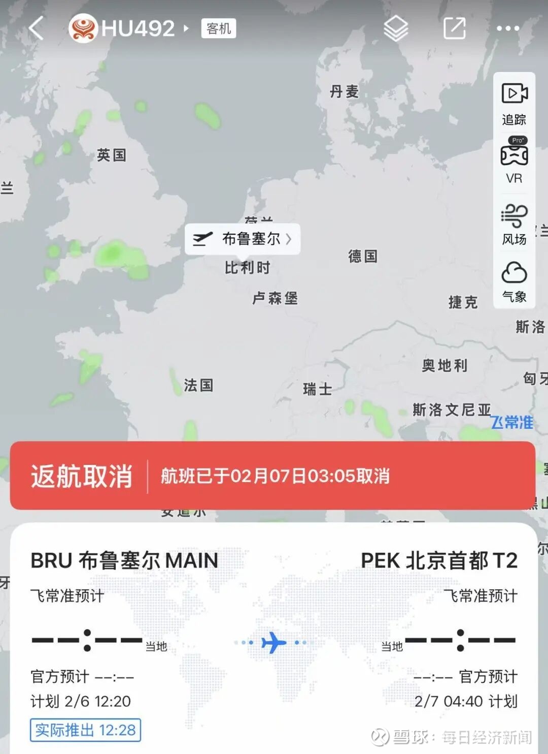 该航班原计划当地时间2月6日12:20从布鲁塞尔飞往北京。有乘客在社交平台发文表示,“以为是普通小事故。下了廊桥结果发现是挡风玻璃碎了。”现代快报记者在社交平台发现,有多名网友称在飞机上看到HU492在空中放油,随后飞机返航。还有网友发布了该架飞机前挡风玻璃破裂的照片。