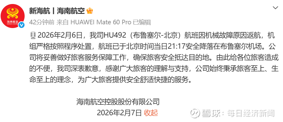 2月7日,海南航空通报:2026年2月6日,我司HU492(布鲁塞尔-北京)航班因机械故障原因返航,机组严格按照程序处置,航班已于北京时间当日21:17安全降落在布鲁塞尔机场。公司将妥善做好旅客服务保障工作,确保旅客安全抵达目的地。由此给各位旅客造成的不便,我司深表歉意,感谢广大旅客的理解与支持,公司始终秉承旅客至上、生命至上的理念,为广大旅客提供安全舒适快捷的服务。