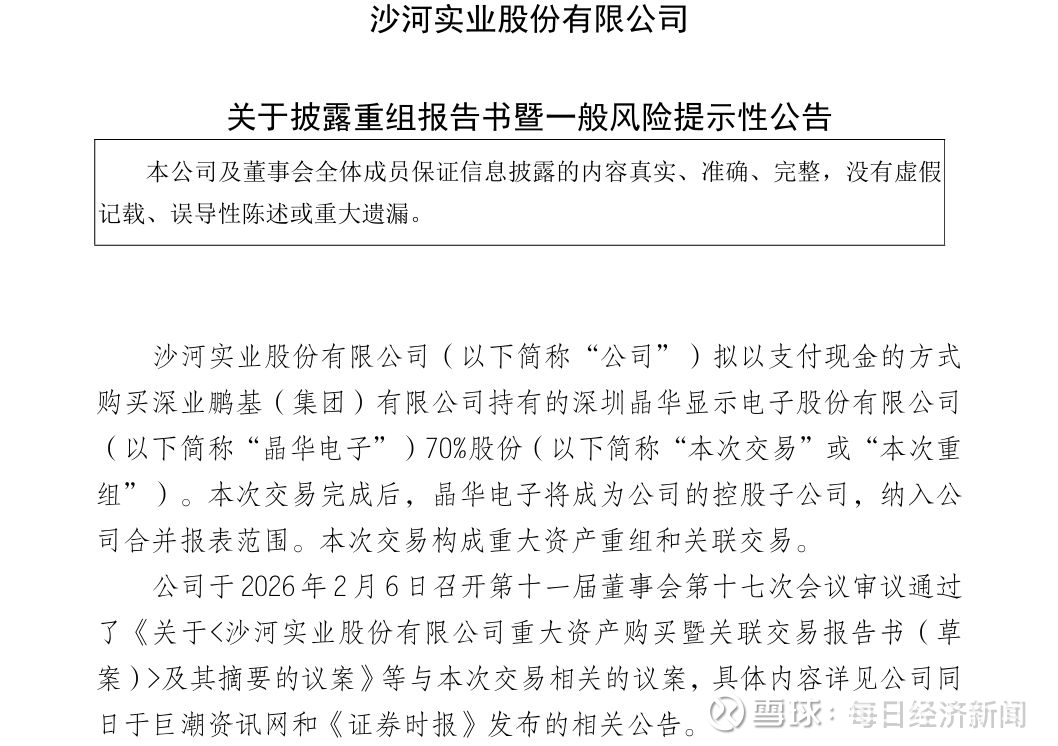 2月6日,沙河股份(000014,股价13.21元,市值31.97亿元)公告称,公司拟以支付现金方式购买深业鹏基(集团)有限公司持有的深圳晶华显示电子股份有限公司(简称“晶华电子”)70%股份。本次交易完成后,晶华电子将成为上市公司的控股子公司,纳入公司合并报表范围,交易价格2.74亿元。本次交易构成重大资产重组。